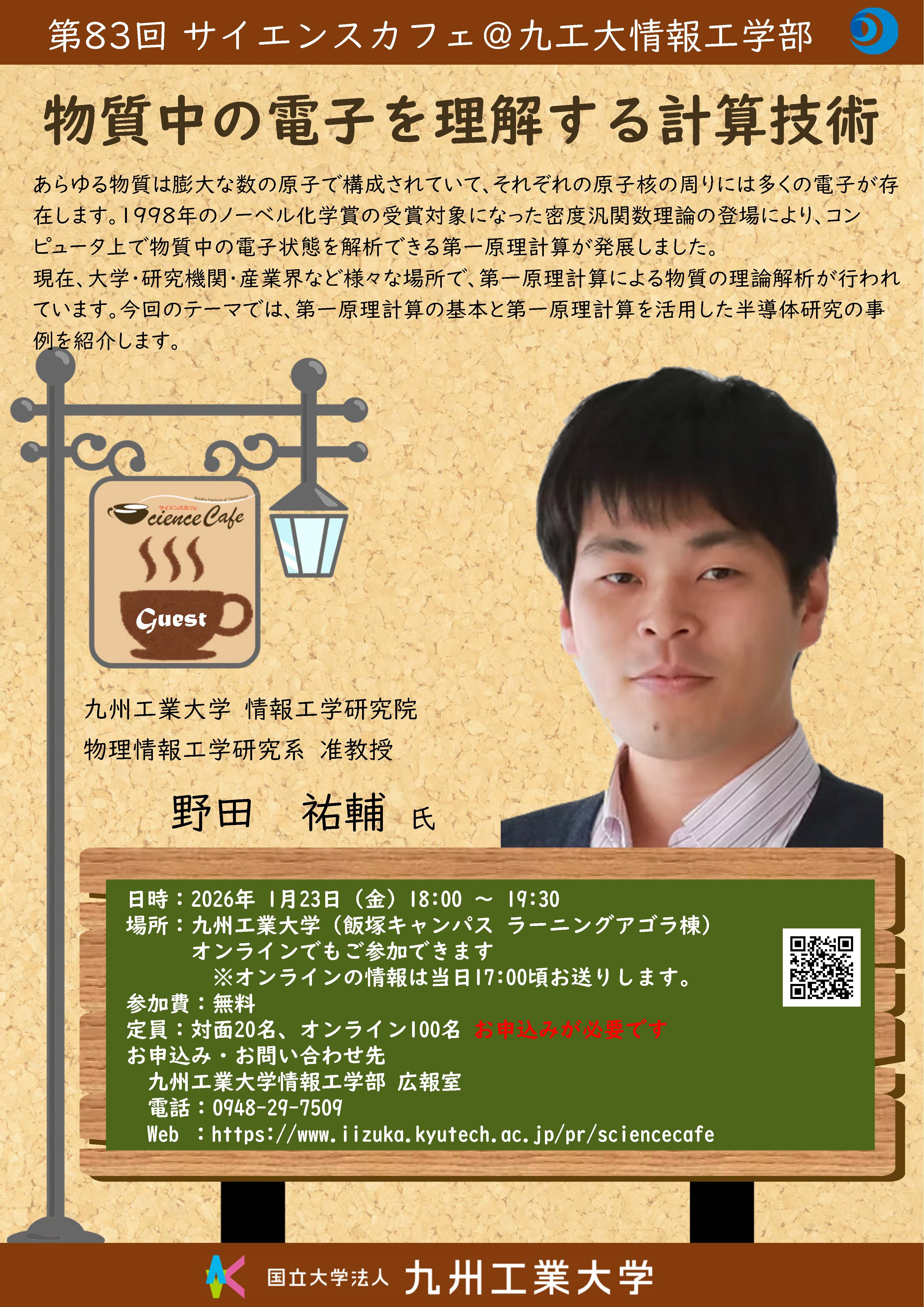 | ゲ ス ト | 野田 祐輔(のだ ゆうすけ)氏 (大学院情報工学研究院 物理情報工学研究系 准教授) |