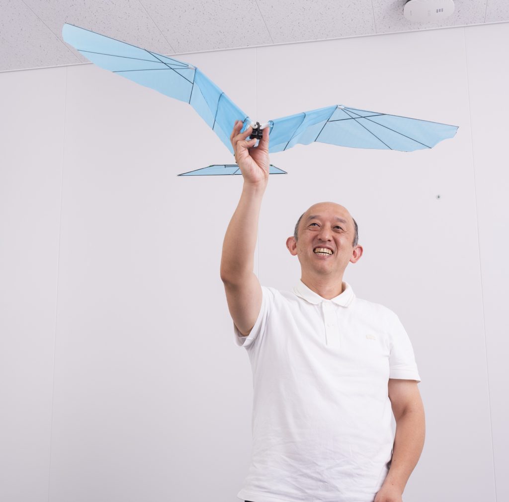 鳥のように羽ばたいて飛ぶ「鳥型ロボット」の研究を行っています。滑空、旋回、ホバリングに加えて、二足歩行やモノを掴む、つかまるといった鳥が持つ全ての機能をロボットで再現するのが目標です。鳥の羽ばたきは飛行機のエンジンやドローンのロータに比べて遅く、威圧感が少ないので、地上の渋滞を避け、伝書鳩のように人から人へ荷物を届ける輸送手段にも使えます。さらに、鳥の飛行の知見を活かして、既存の航空機の進化や羽ばたき航空機の実現も目指しています。