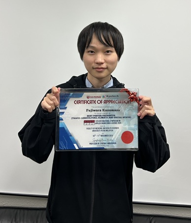 令和7年11月10,11日で開催された国際会議13th International Symposium on Applied Engineering and Sciences (SAES2025)において、博士課程前期課程1年生の藤原和正さん(花田研究室)が「Functional analysis of gene encoding a novel hormone-like peptide in rice」という題目で発表し、発表賞を受賞しました。
