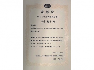 知能情報工学分野 > お知らせ > 本学学生2名が電子情報通信学会福祉情報工学研究会において、WIT学生研究奨励賞をダブル受賞しました