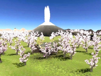 | 制作教材 | 地学や火山に関する知識を学べる仮想空間を開発。 火山の噴火する様子を遠くの足場から俯瞰して観察したり、近くで体験したりできる設計で、学習した知識確認するクイズに解答すると、火山噴火後に時間が経過した後の植生の変化を観察できるエリアに移動できる。 |