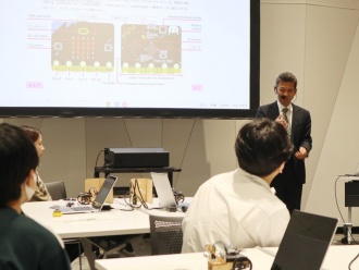 あわせて体験コーナーを設置し、micro:bit CreateAIを用いた小学生向けの機械学習入門教材を展示しました。手首に装着したmicro:bitに動作パターンを学習させることで、別のmicro:bitのLEDが点灯する仕組みを体験し、楽しみながら機械学習の基礎に触れてもらいました。