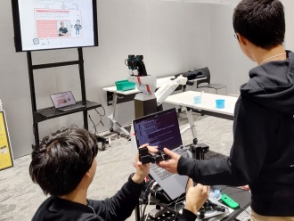 12月22日、学生プロジェクト「Hibikino-Musashi@Home(HMA)」が、「ロボット開発者の仕事」をテーマとした体験プログラムを提供しました。参加者を新人開発者として迎え、配膳や清掃を行うロボット、HMAが開発を進める汎用型サービスロボットについて解説した後、実機のホームサービスロボットの操作体験を行いました。参加者は、家庭内での困りごとを保護者に聞き取り、HMAの学生のサポートを受けながら、ロボットによる解決方法のアイデアを発表しました。事前登録した参加者に加え、展示ブースは多くの来場者が訪れました。