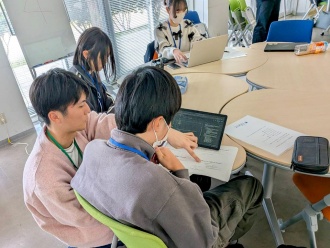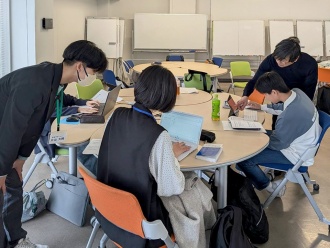 午前は、高大接続センターの安永 卓生 センター長が講義を行い、データと情報の違いやデータ駆動型社会について解説しました。実習では、Google Colaboratoryを用い、Pythonと数理モデルの基礎を学びました。午後からは、4班に分かれて各自で問いを設定し、仮説を検証できるオープンデータを探しました。参加者は、Pythonでプログラミングを行いながらデータを可視化し、分析に取り組みました。九工大生や生成AIと相談しながら、プログラムの最後には画面を共有しながら発表を行いました。