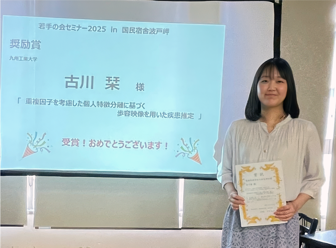 2025年12月5日(金)〜6日(土)に国民宿舎 波戸岬(佐賀県唐津市)で開催された、情報処理学会九州支部「2025年度若手の会セミナー」において、大学院情報工学府博士後期課程 情報創成工学専攻1年の古川 栞さんが、奨励賞を受賞しました。奨励賞は、若手の会セミナーにおいて発表された研究の中から最も優秀であった1件に贈られる賞です。